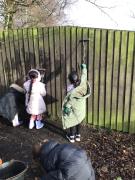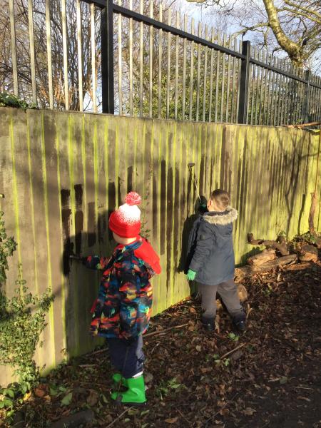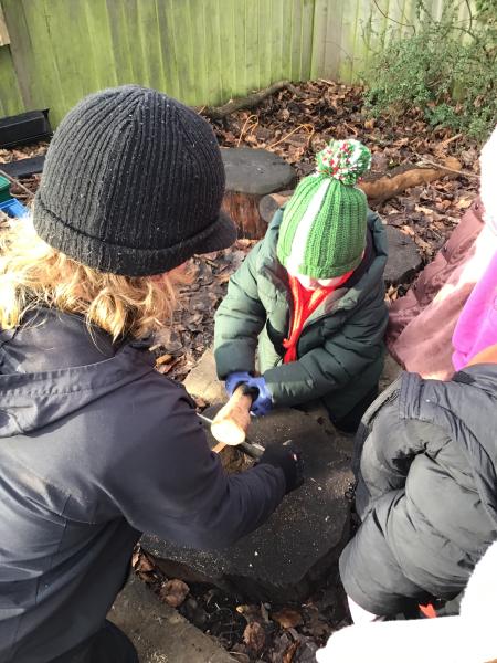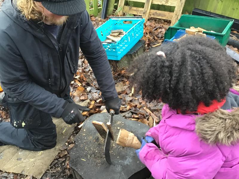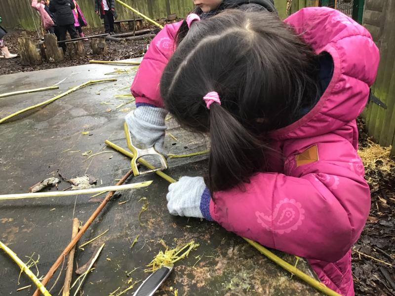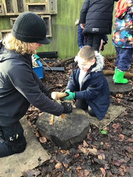 We were creating mud paintings, peeling sticks and chooping wood using lots of different tools.